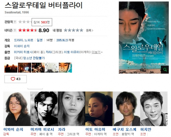 해외영화 | 스왈로우테일 버터플라이 1996 페이지 정보 작성자 마당발 작성일16-03-15 10:57 댓글0건 관련링크 http://applefile.com/contents/boardTheme.htm?idx=10581823 414회 연결 본문 이와잉 슌지 감독의 감성대작! 영화 스왈로우테일 버터플라이입니다. 웹하드: 애플파일 댓글목록 등록된 댓글이 없습니다.