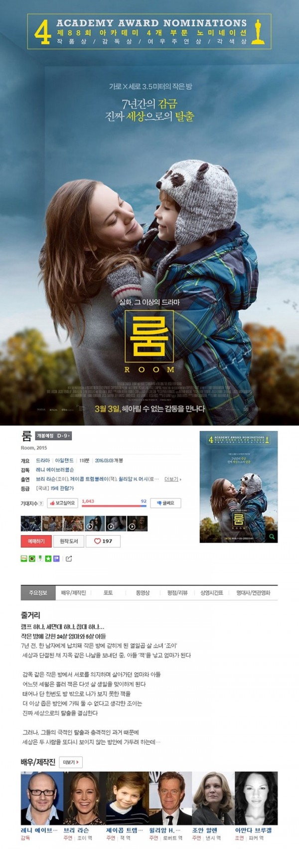 해외영화 | 룸 2015 페이지 정보 작성자 blue 작성일16-03-14 11:42 댓글0건 관련링크 http://vegadisk.com/contents/view.php?from_cate=MVO&idx=10856355 409회 연결 본문 램프 하나, 세면대 하나, 침대 하나... 작은 방에 갇힌 24살 엄마와 5살 아들. 웹하드: 베가디스크 댓글목록 등록된 댓글이 없습니다.