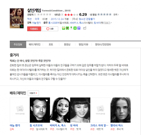 해외영화 | 살인게임 2015 페이지 정보 작성자 마당발 작성일16-03-04 15:39 댓글0건 관련링크 http://moviezoa.cafe24.com/bbs/board.php?bo_table=MOVIE2&wr_id=4701 536회 연결 본문 2015년도에 개봉한 액션영화 '살인게임'입니다. 머리 식힐 겸 보기 괜찮은 영화입니다. 웹하드: 무비조아 댓글목록 등록된 댓글이 없습니다.