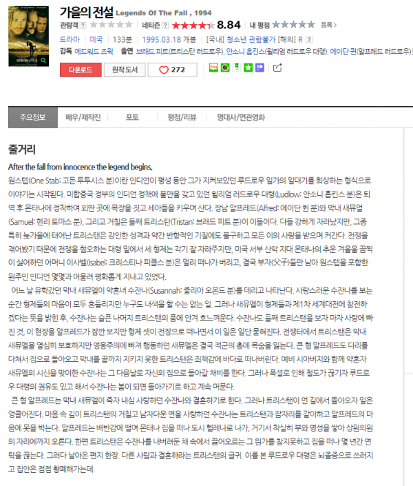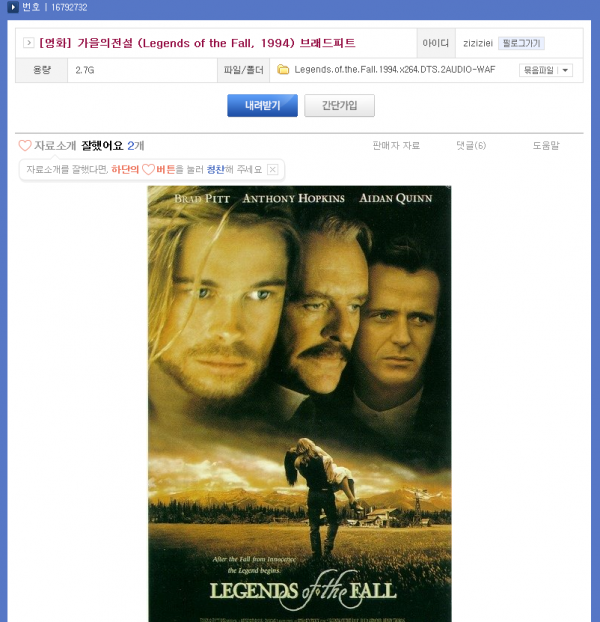 해외영화 | 가을의 전설 1994 페이지 정보 작성자 마당발 작성일16-03-07 16:35 댓글0건 관련링크 http://www.filejo.com/main/popup/bbs_info.php?idx=30251981 524회 연결 본문 1994년도에 개봉한 브래드피트 주연, 영화 가을의 전설입니다. 웹하드:파일조 댓글목록 등록된 댓글이 없습니다.
