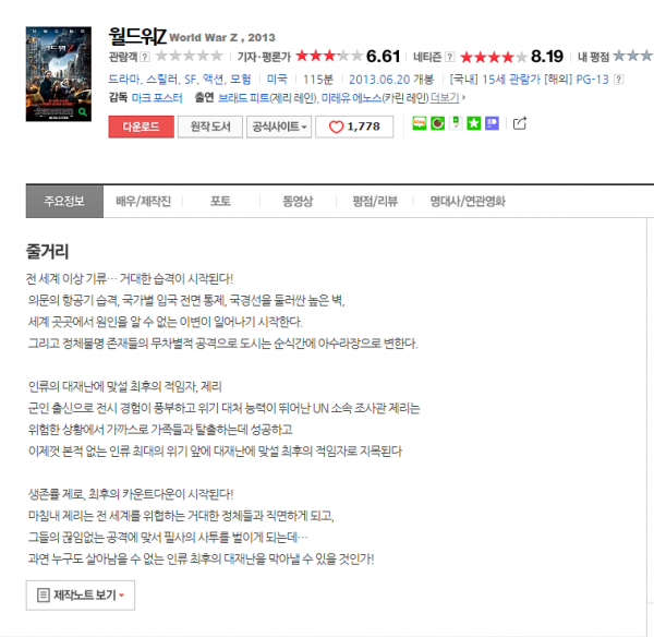 해외영화 | 월드워Z 2013 페이지 정보 작성자 마당발 작성일16-03-07 16:50 댓글1건 관련링크 http://www.filejo.com/main/popup/bbs_info.php?idx=30193560 517회 연결 본문 2013년도 개봉한 영화 월드워Z입니다. 전세계 이상기류, 거대한 습격이 시작된다! 웹하드: 파일조 댓글목록 깨몽님의 댓글 깨몽 작성일 16-03-08 19:21 몇년전에 좋아하는 빵아저씨 때문에 보러 갔었는데 허접한 내용에 실망한 기어 밖엔 없는 영화라 몇 자 남깁니다. 몇년전에 좋아하는 빵아저씨 때문에 보러 갔었는데 허접한 내용에 실망한 기어 밖엔 없는 영화라 몇 자 남깁니다.