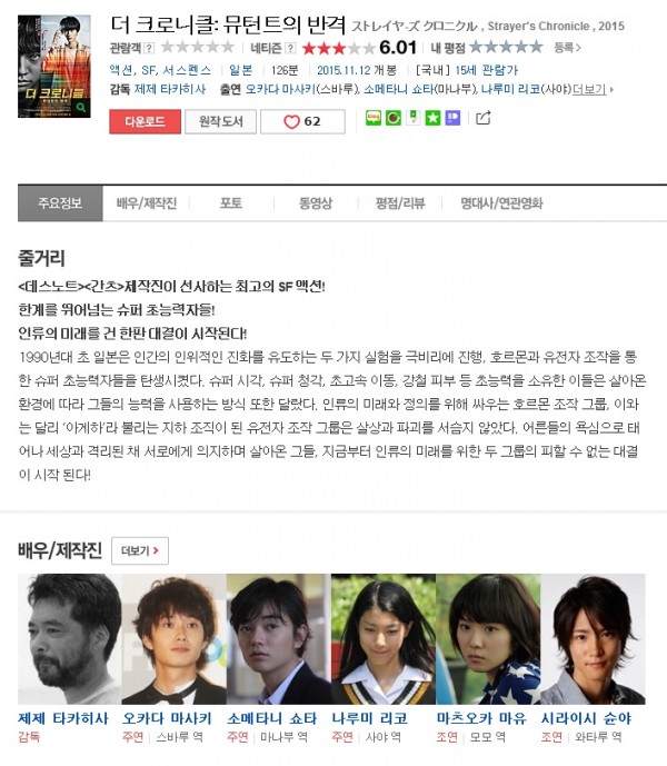 해외영화 | 더 크로니클:뮤턴트의 반격 2015 페이지 정보 작성자 마당발 작성일16-03-04 15:26 댓글0건 관련링크 http://bbs.pdpop.com/board_re.php?mode=view&code=F_02_01&contentid=&sz… 592회 연결 본문 영화 '기생수' 소메타니 쇼타와 '고백' 오카다 마사키가 주연을 맡은 일본영화 더 크로니클:뮤턴트의 반격입니다. 웹하드: 피디팝 댓글목록 등록된 댓글이 없습니다.